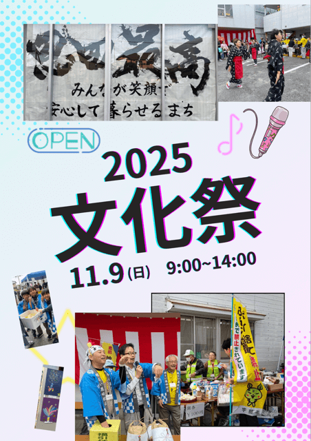 恩田地区文化祭のご案内です。11月9日(日)9:00~14:00、恩田ふれあいセンターで行います。今年度は、作品展示に食べ物バザー、そして福引抽選会!ご家族でまたご友人を誘ってお越しください。文化祭のチラシはこちら。